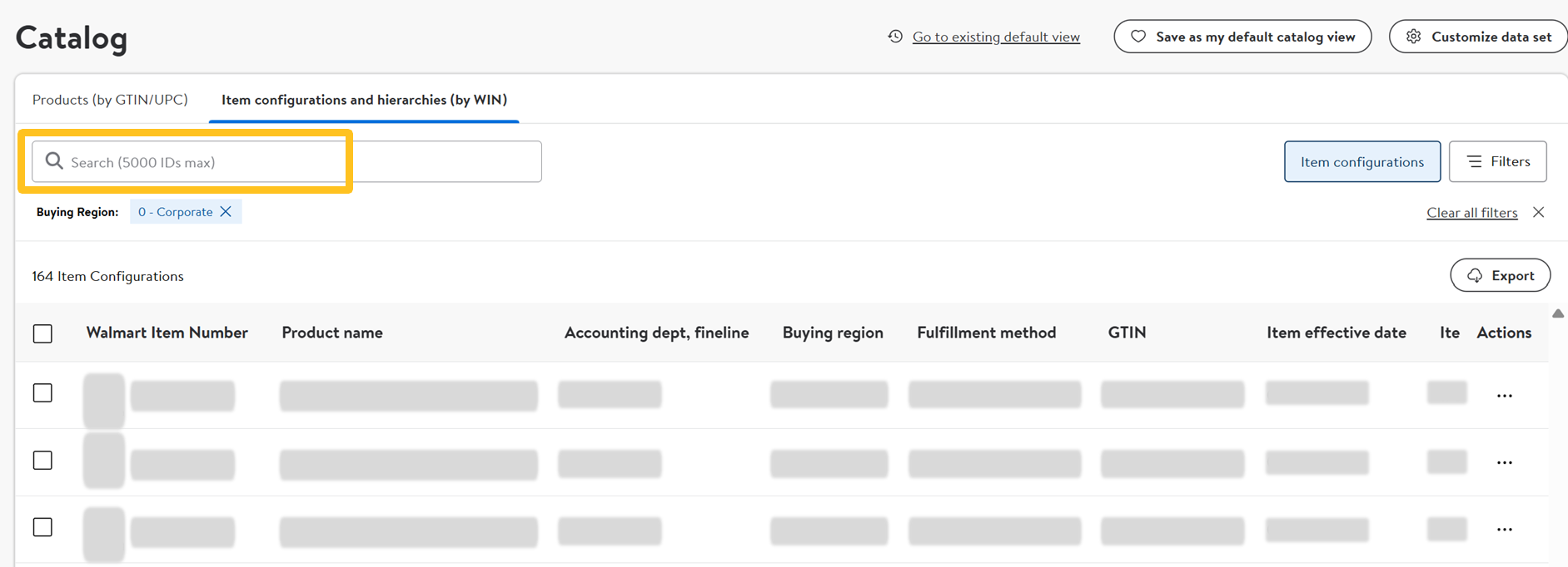 In the left navigation menu, click Items and inventory and select Catalog. In the Products or Item configurations and hierarchies) view, click the Product ID search bar.Copy and paste the Product IDs in the search bar. Remember to select the ID Type if you’re searching for multiple items (all of your Product IDs must be the same type). You do not need to select an ID Type if you’re searching for only one item. Then, click the Apply button.