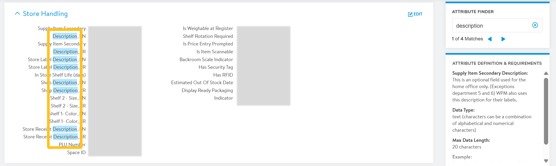 The Item Configuration & Supply Chain details are organized by groups of attributes. Click the header to close or expand a grouping.If you need help locating a specific attribute on the page, enter the attribute name in the Attribute Finder on the right side.Attributes that match your search will be highlighted on the page. Use the arrows in the Attribute Finder to go to the previous or next match.
