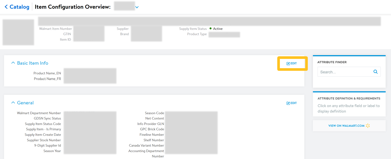 You cannot edit content attributes (e.g., Product Name) from the Item Configuration Overview page. Click the Walmart Item Number at the top of the page and select the Product (GTIN) to go the Product & Offer Overview page.