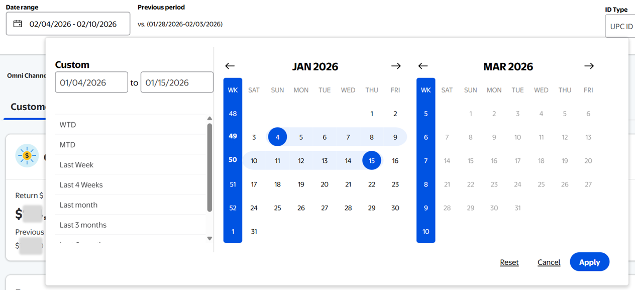 - For Owned and DSV: Select the Date range that you want to look at. You can select up to six months at a time for Owned and up to 1 year for DSV. The scorecard will show data for the selected timeframe compared to the date range under Previous period.