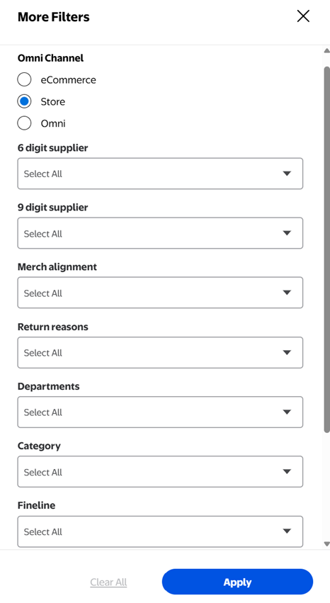 - For Owned: You can filter by Omni Channel (eCommerce, Store, Omni), 6-digit Supplier ID, 9-digit Supplier ID, Merch Alignment, Return reasons, Departments, Category, Fineline, and/or Buyer ID. Click the Apply button to view the returns or claims that match the criteria you selected.