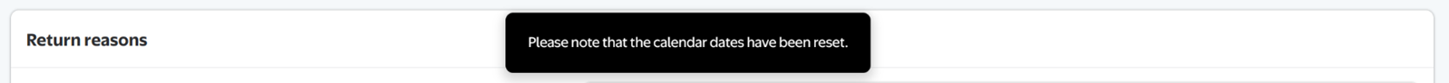 The calendar resets when you switch between the claims and returns tabs to allow for lags in pulling claims data (i.e., you will need to select the Date range again). You will see this message at the bottom center of your browser window as a reminder.