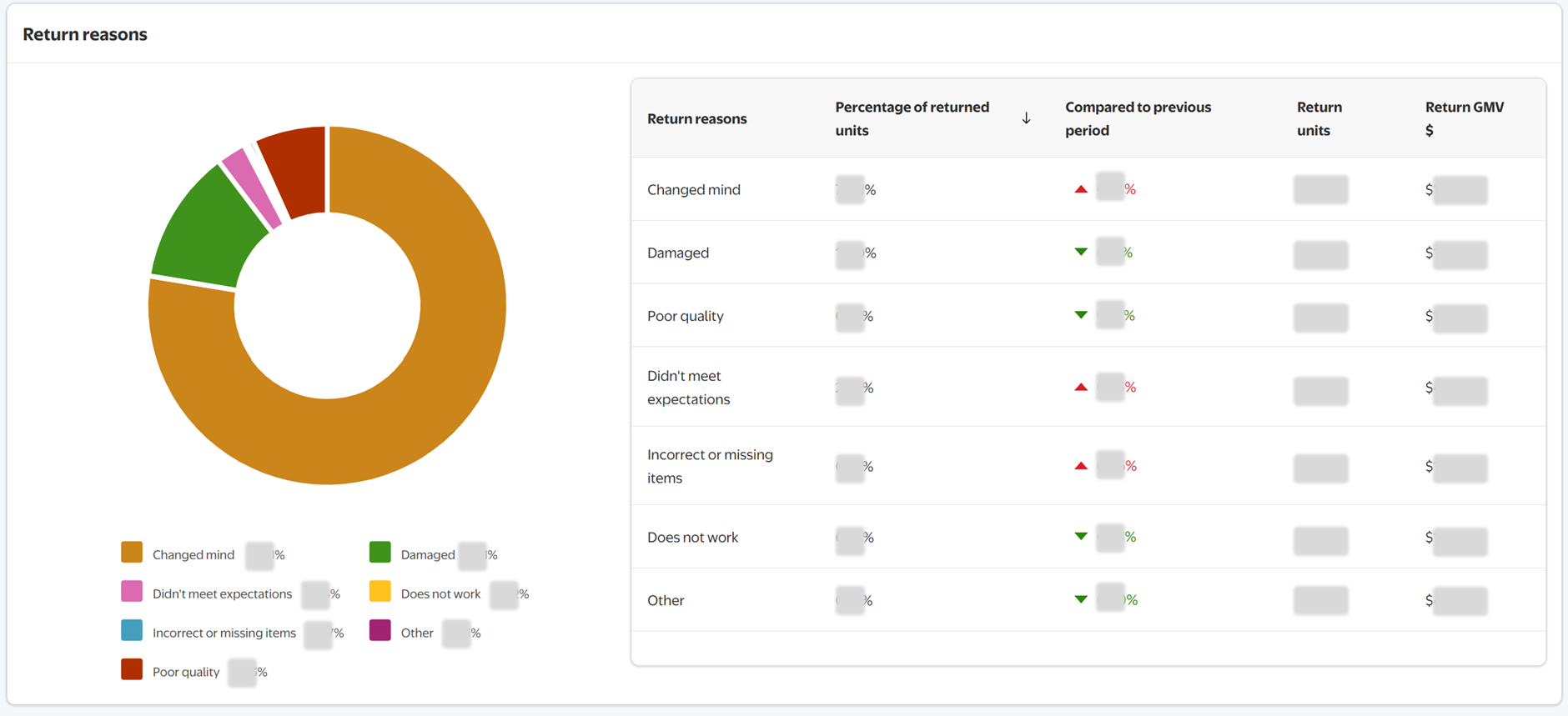 This section breaks down your returns by the reason code selected by the customer. The table provides a breakdown of your total returns and the breakdown by reason. You will see the reason code, return units, return in dollars, percentage of returns for that reason code, and the percentage comparison of last year (for the same timeframe you set in the filters) and this year, if available.