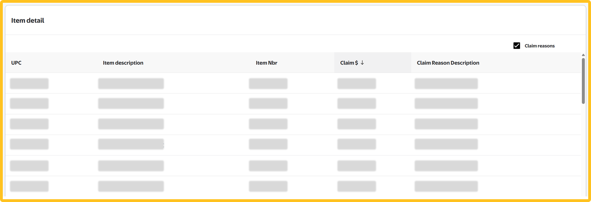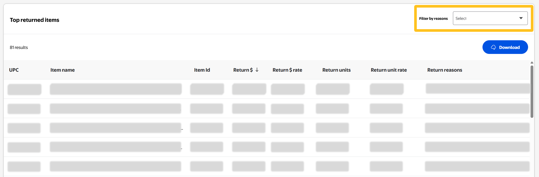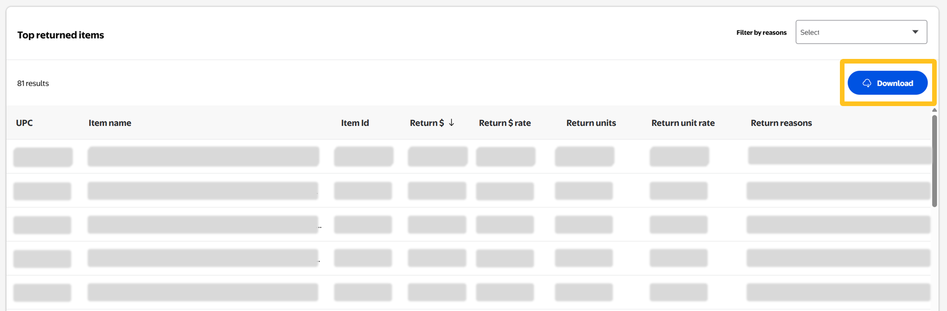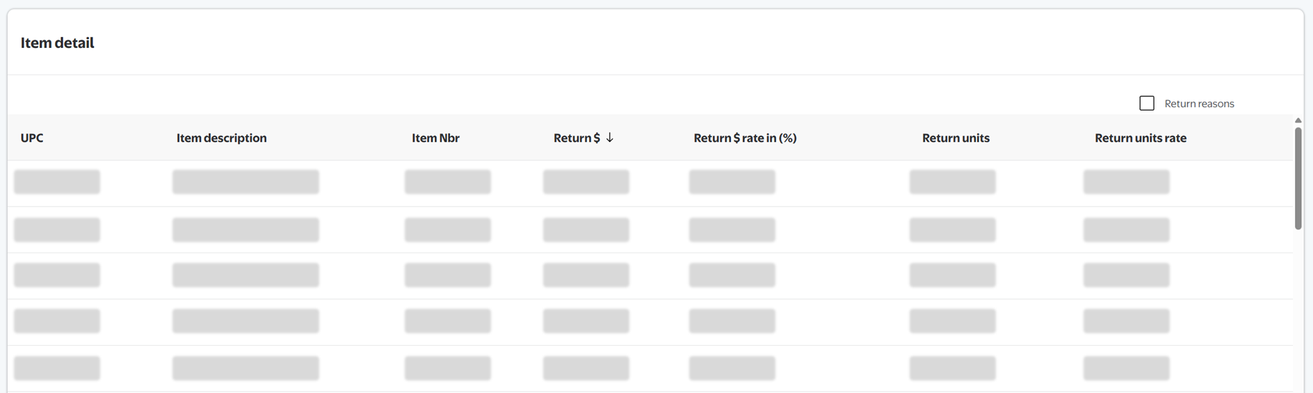 This section provides insights into the individual items being returned. By default, the table is filtered by the highest return $ to the lowest return $. You will see the UPC, Item Description, Walmart Item Number, Return $, Return Rate, Return Units, and Return Units Rate.