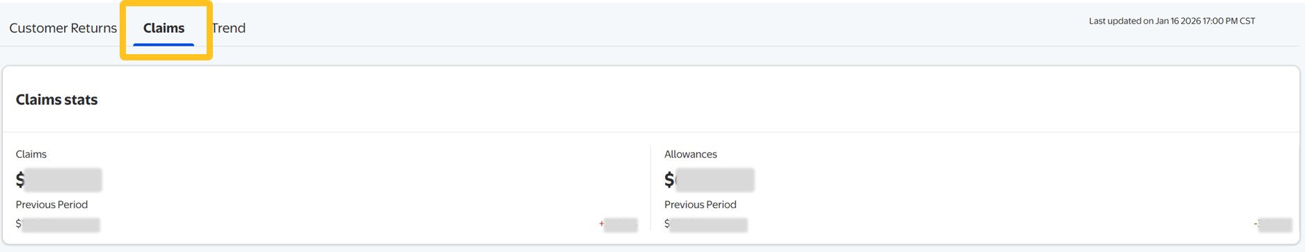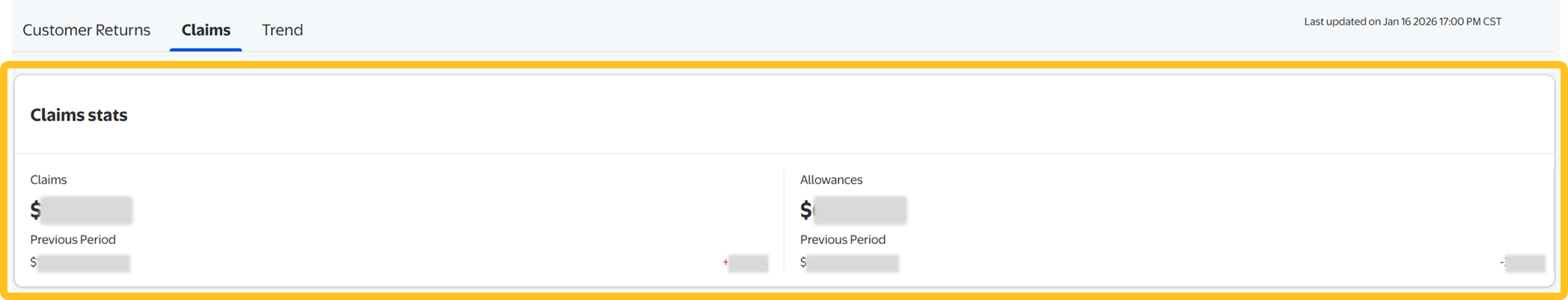 Quickly view overall Claims and Allowances data for the selected time period, and compare it to the Previous Period data.