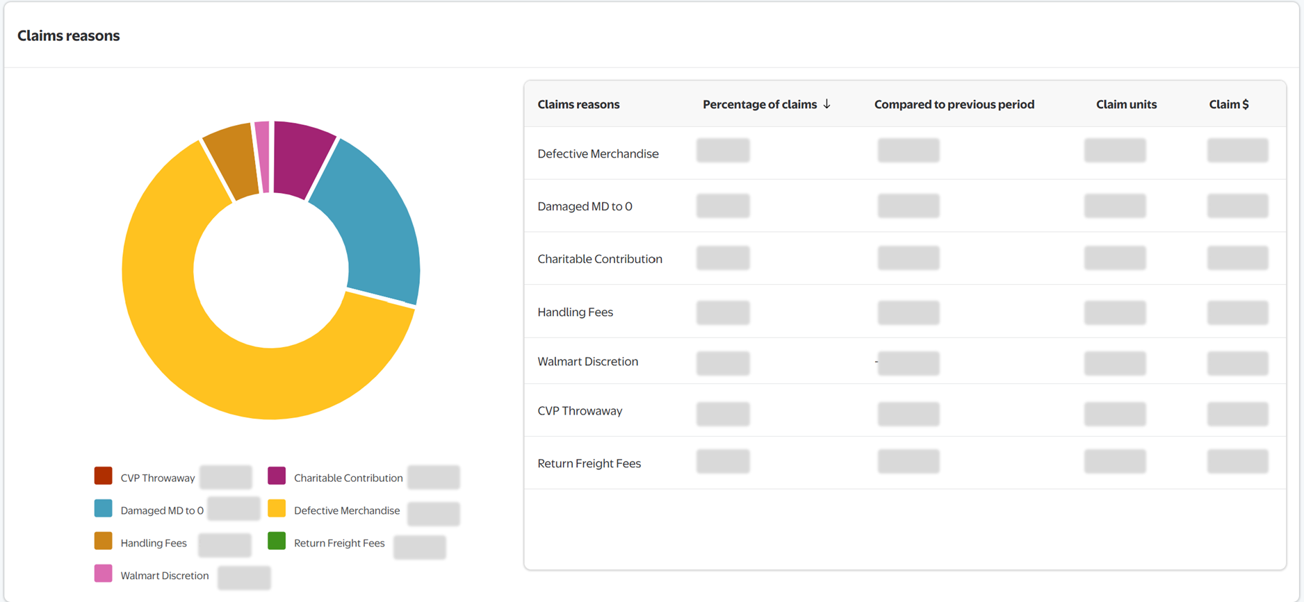 This section breaks down your claims by the reason code, including handling fees. The table provides a breakdown of your total claims and the breakdown by reason. You will see the reason code, the percentage comparison of last year (for the same timeframe you set in the filters), claim units, and claim dollars.