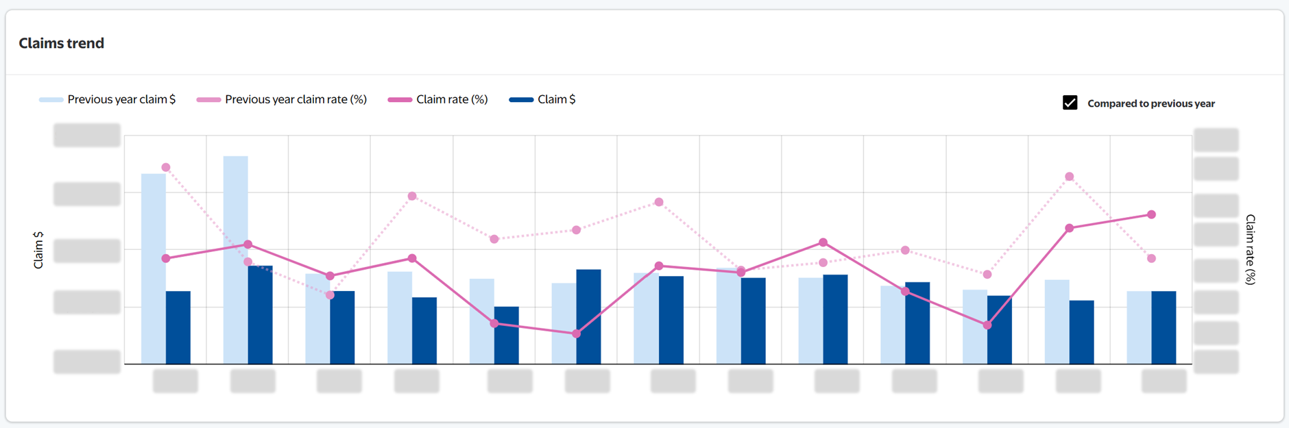 This graph shows the claim dollar (Claim $) trend for the last six months. Click the check box at the top right corner to see the comparison to the previous year.