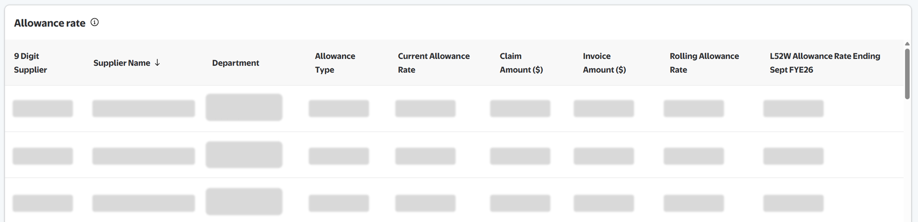 The Allowance rate table shows the allowance rates for each 9-digit Supplier ID on your current contract as well as the L52W estimated allowance rate.