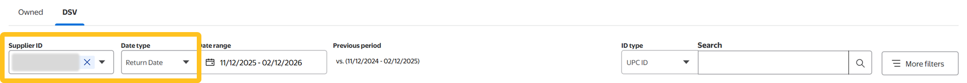 - For DSV only: Select the Supplier ID (if you have multiple) and Date type (Return Date or Order Date).