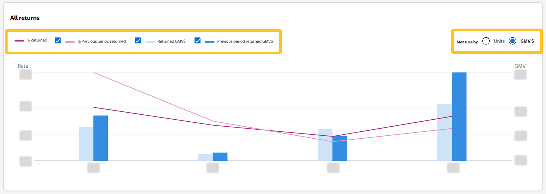 View the return $ and GMV return rate for the selected timeframe compared to the previous period.