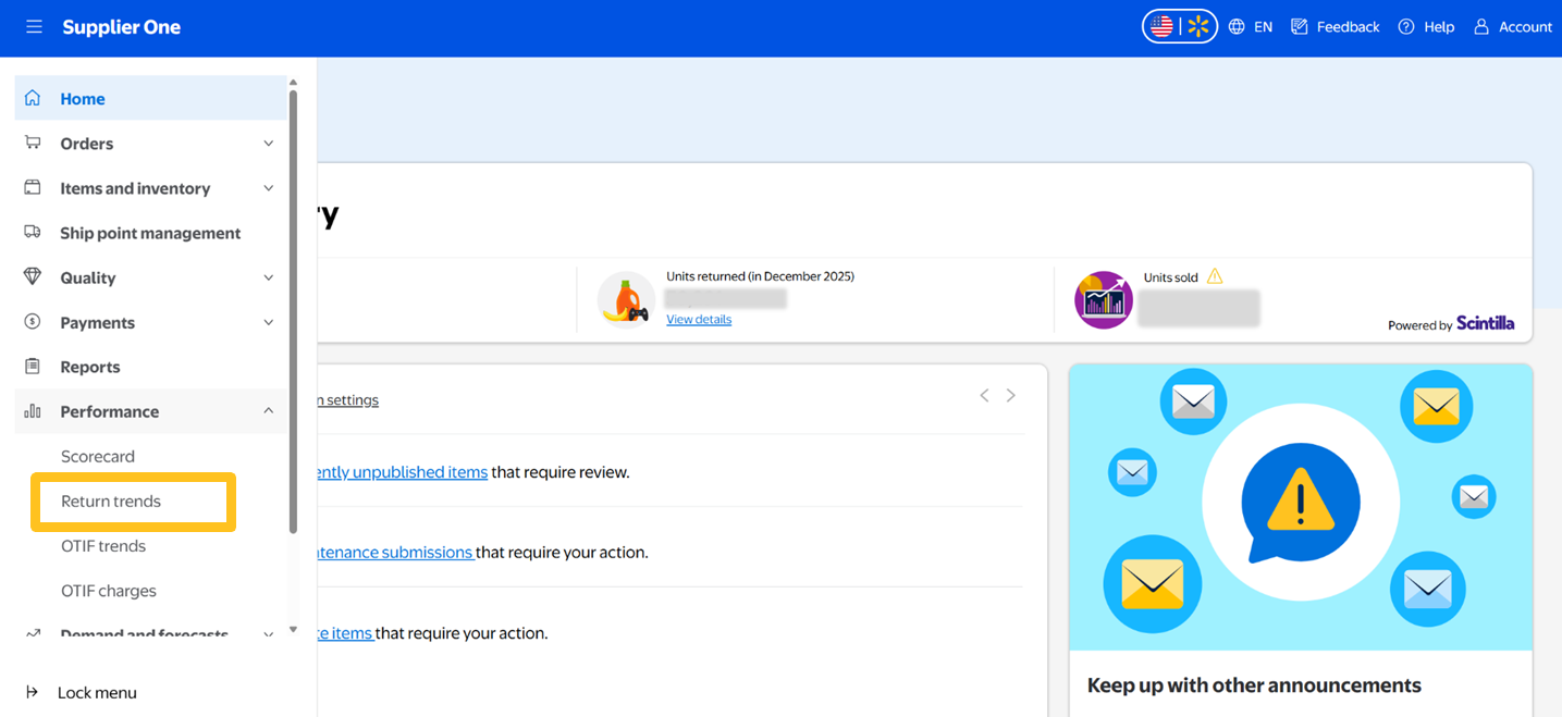 In the left navigation menu of Supplier One, click Performance and select Return trends to view Return Trends and the Claims and Returns Scorecard.