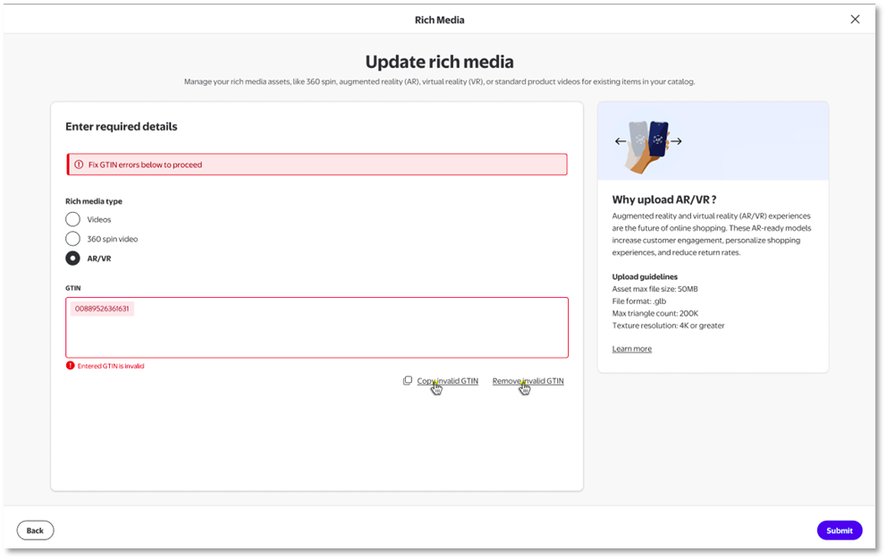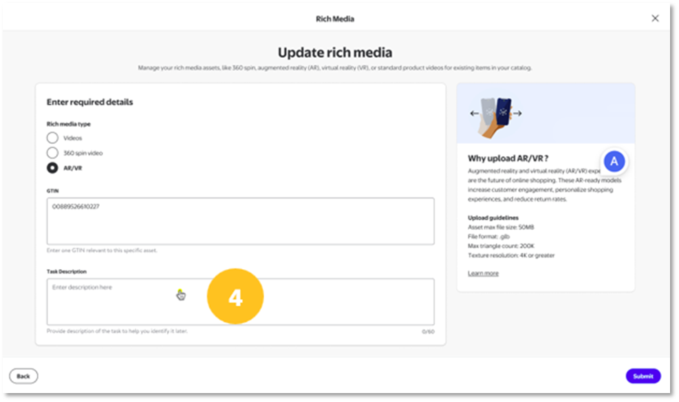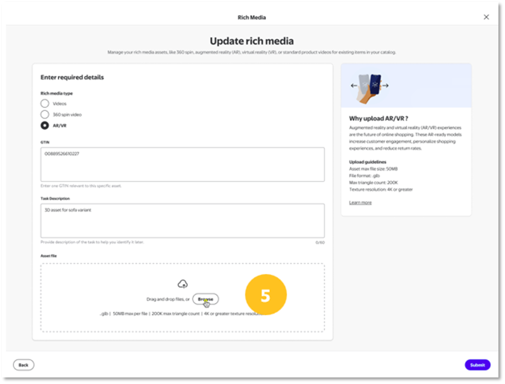Step 5: Once the task description has been entered, please provide the 3D asset file that you would like to be associated with the GTIN provided in the previous step. These files can be dragged and dropped into the application or user can choose to use the file browser.