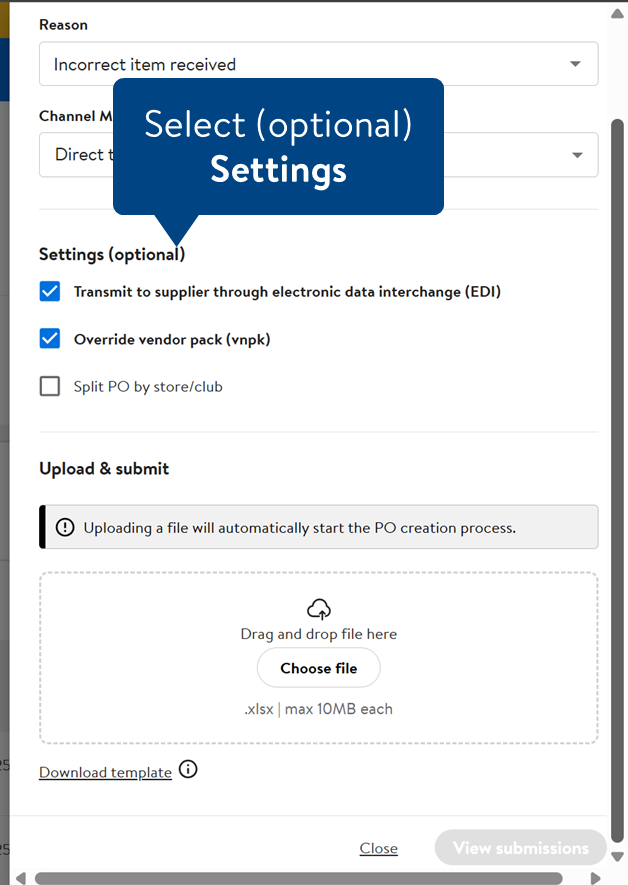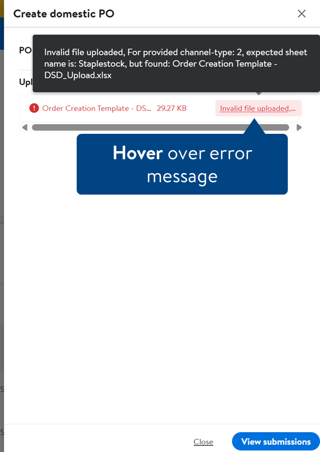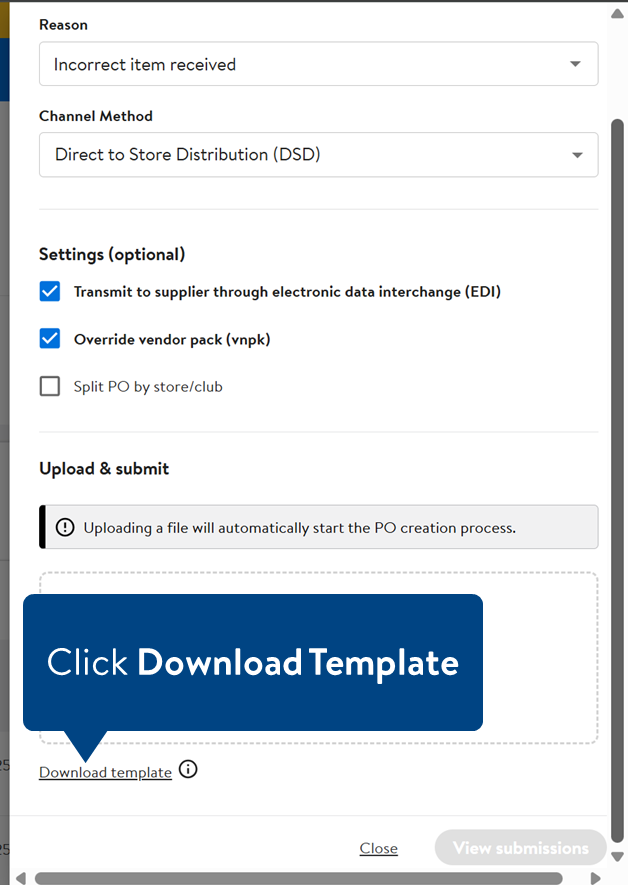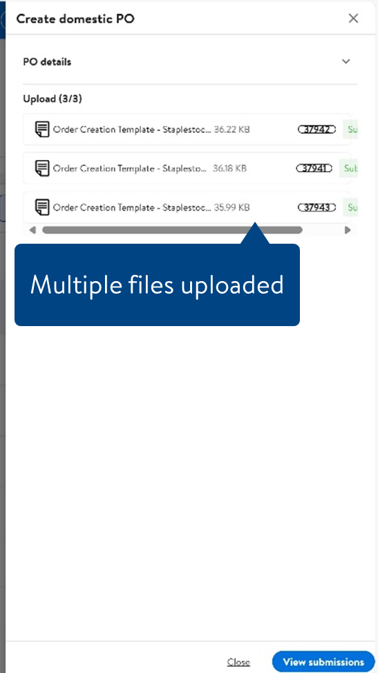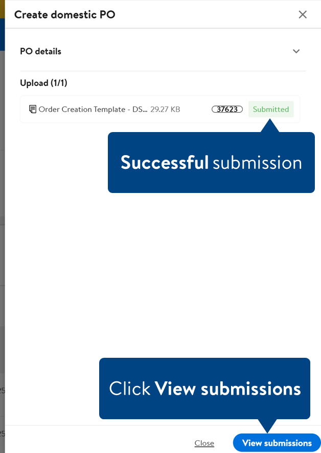 You will see Submitted in green text if it was successfully uploaded. Click View submissions to view all PO creation requests.