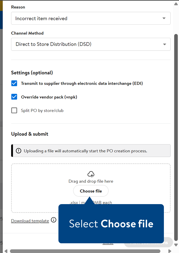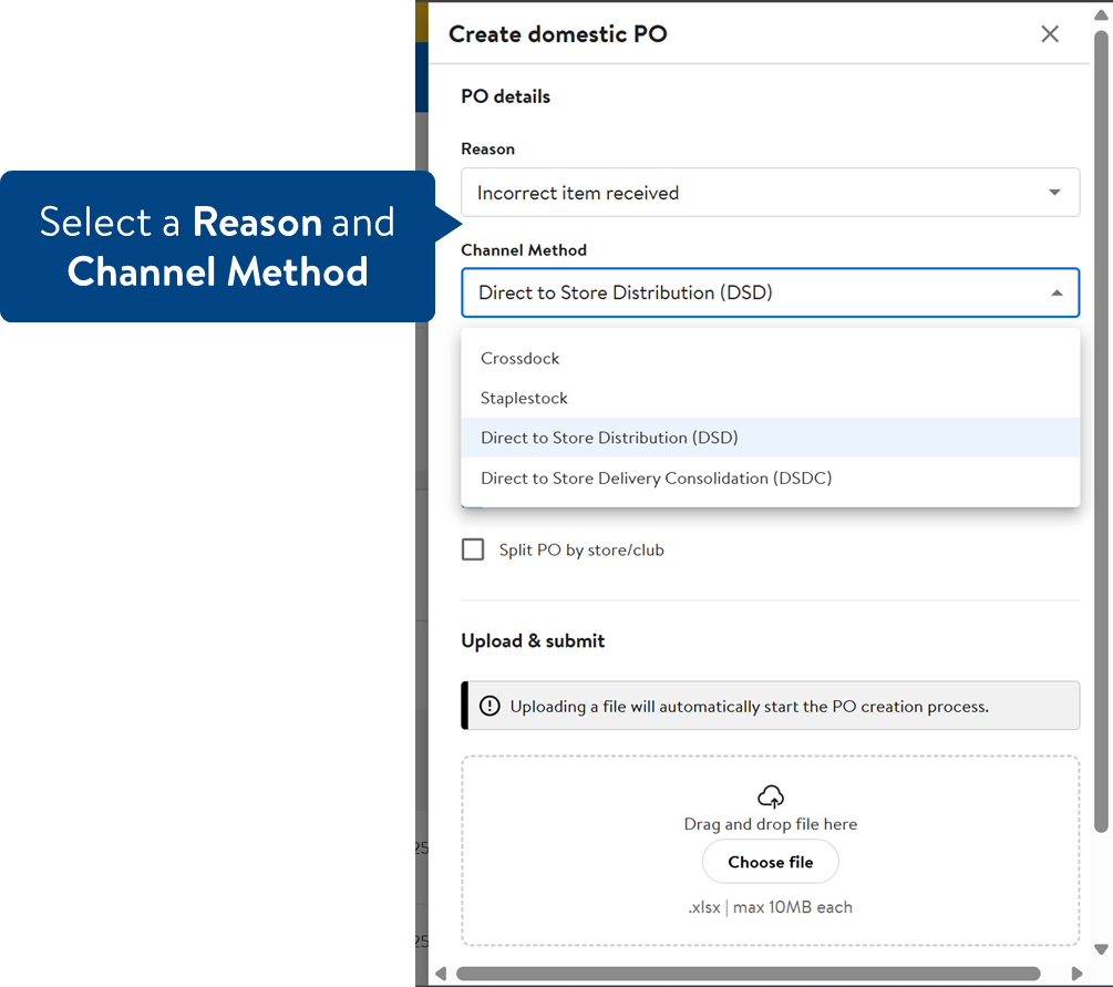 In the PO details, select a Reason and Channel Method from the dropdowns.Crossdock: PO Type 20 Staplestock: PO Type 3 DSD: PO Type 7 DSDC: PO Type 73