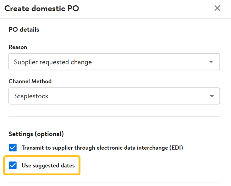 You can apply (optional) settings to the PO. The available settings will change based on the reason and channel method selected.