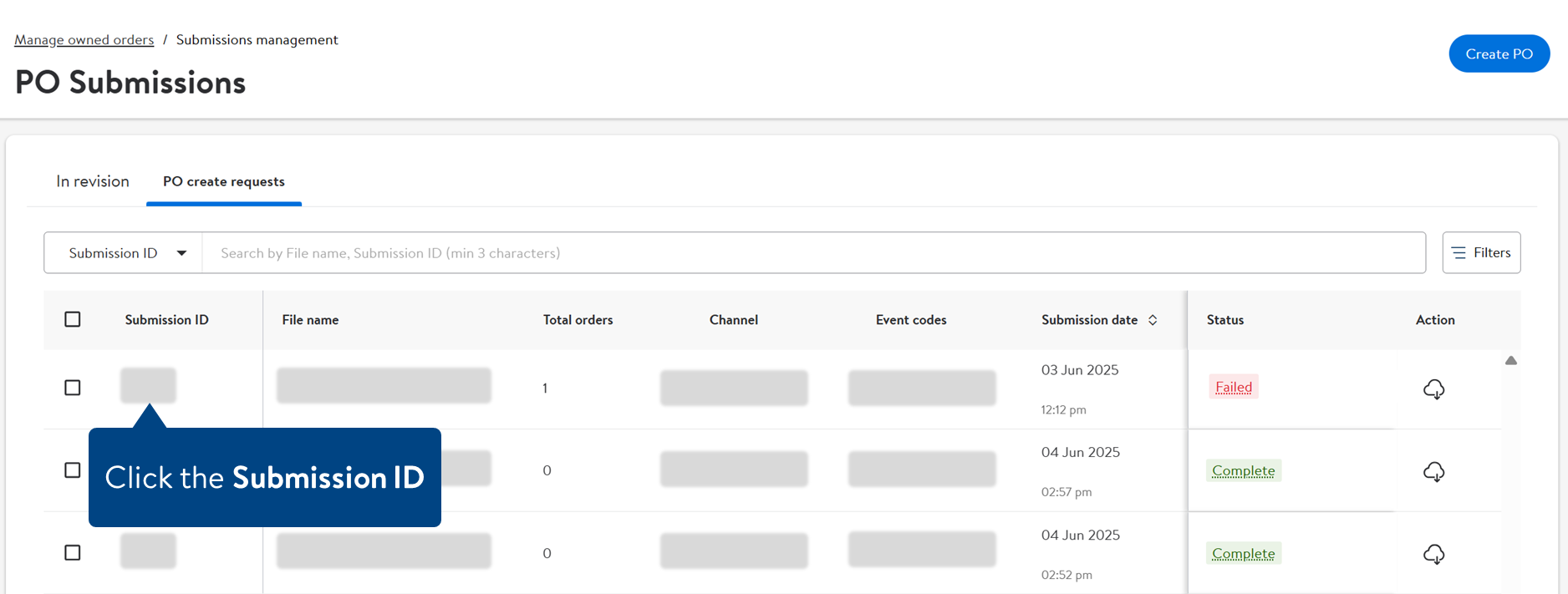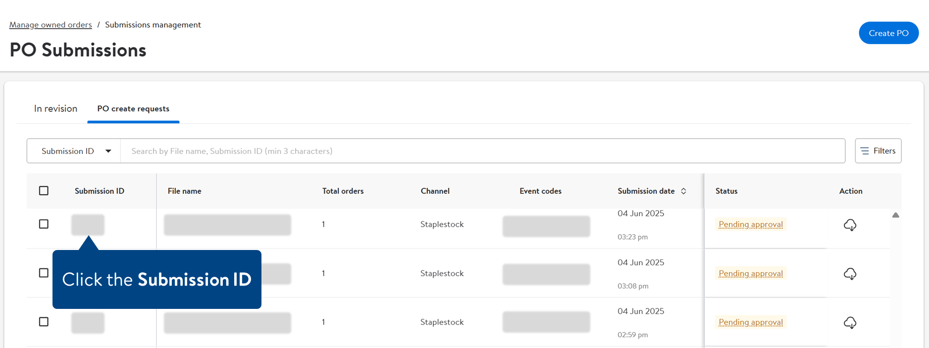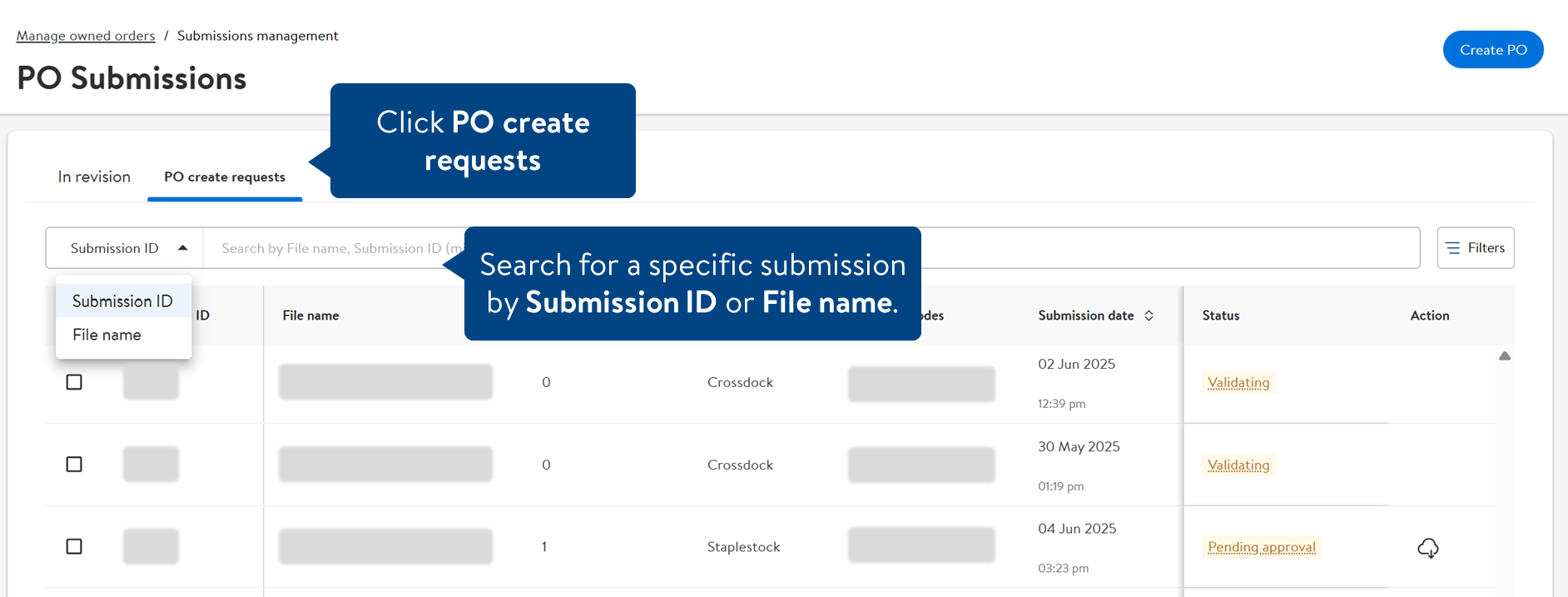 Under PO create requests, use the search bar to find a specific submission by the Submission ID or File name.