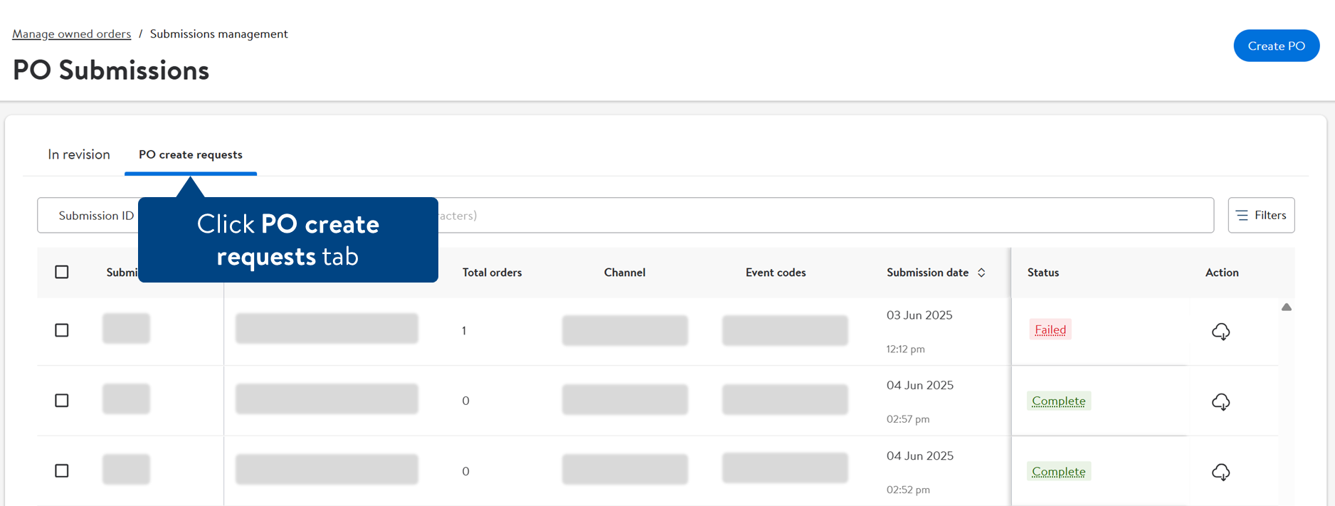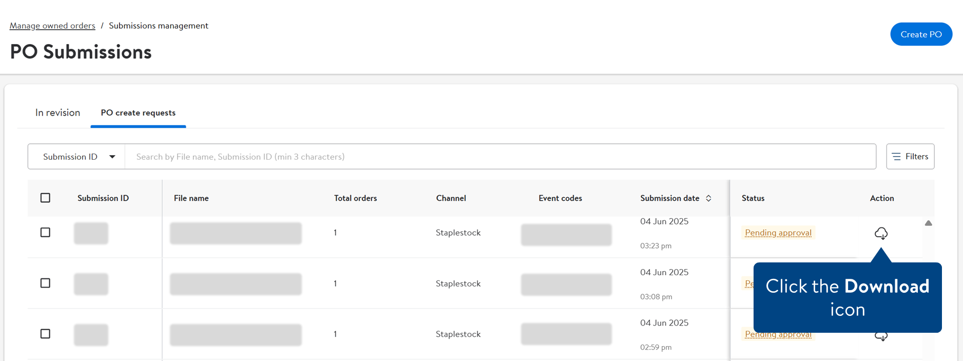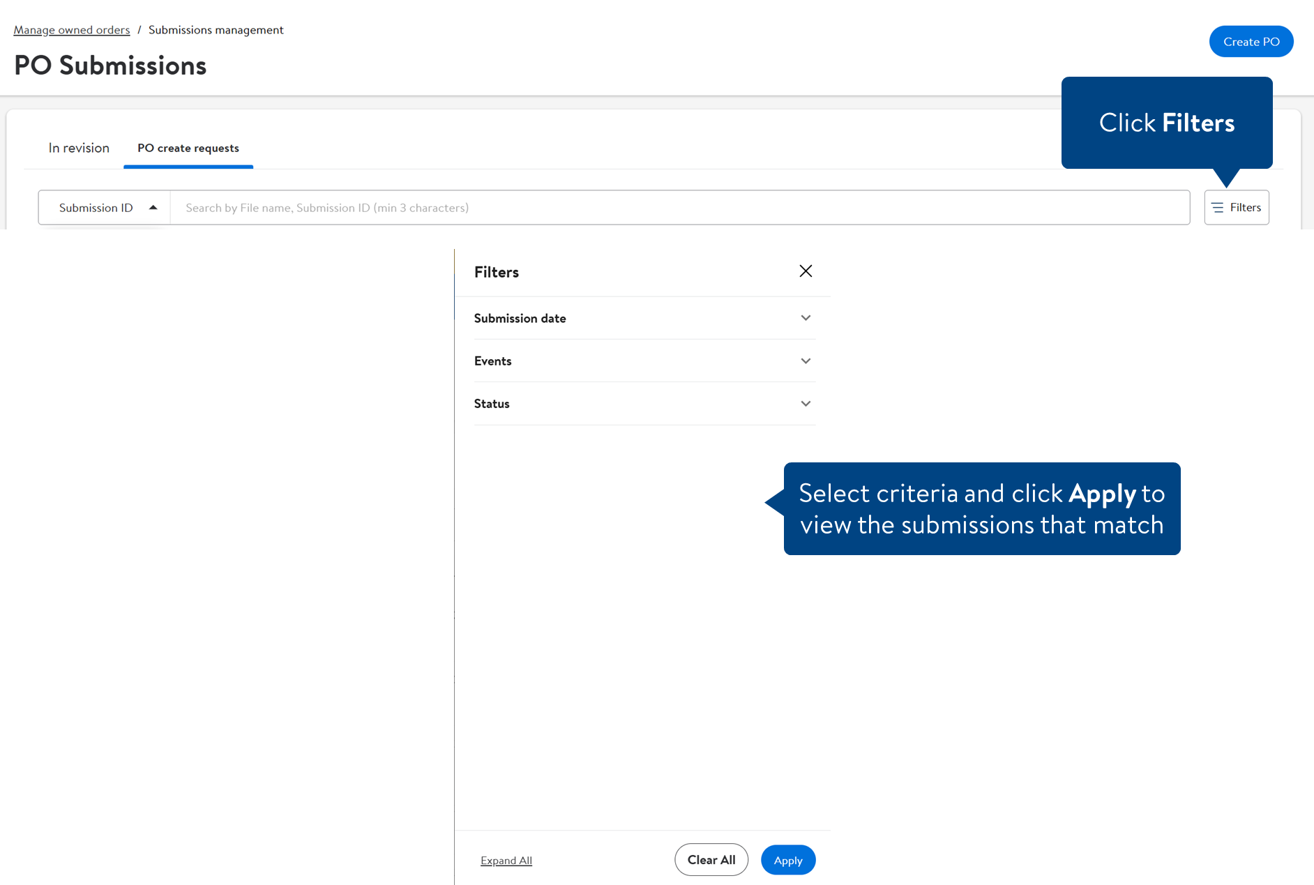 Under PO create requests, use the search bar to find a specific submission by the Submission ID or File name.