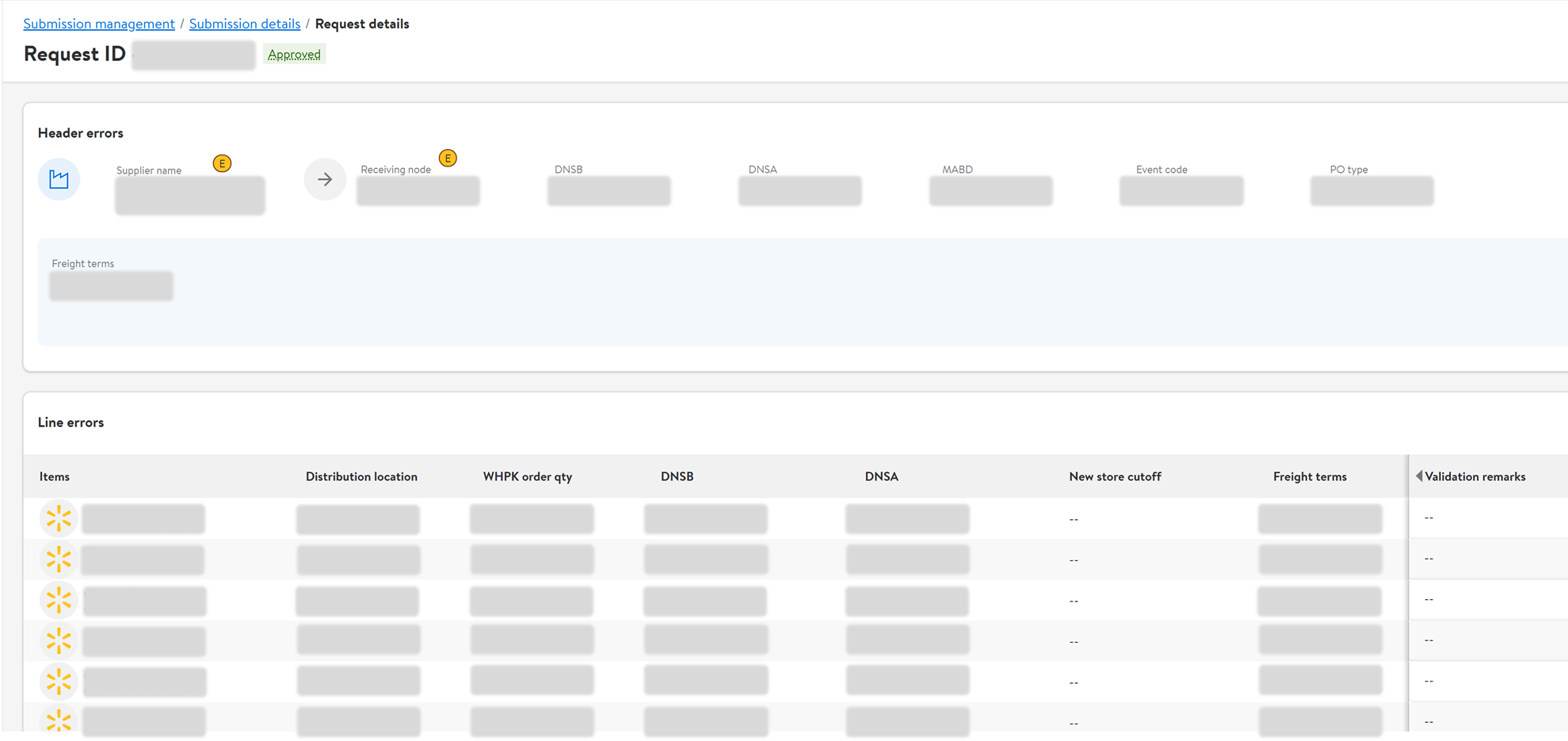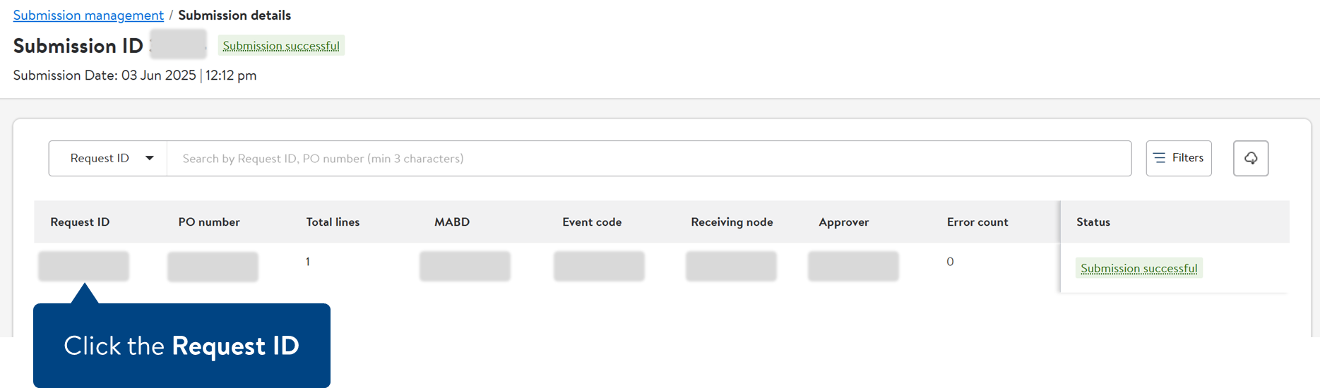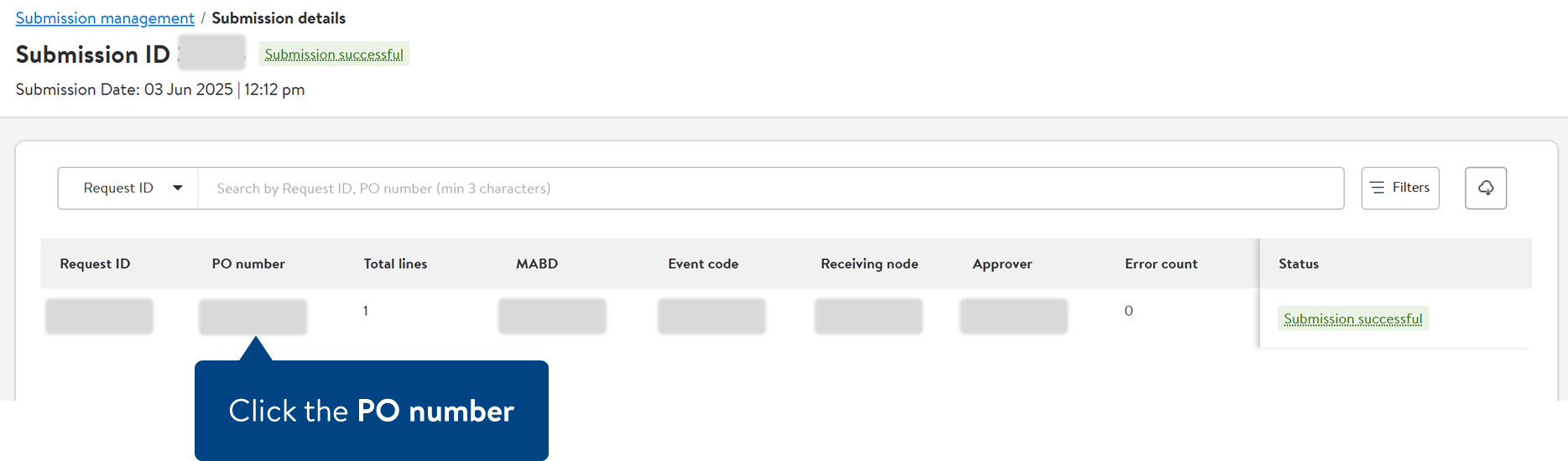 Select the Submission ID to view details of the PO including Request ID(s), PO number(s), Total Lines, MABD, Event code, Receiving node, Approver, Error count and Status.