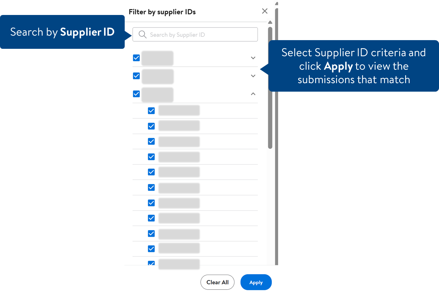Search by Supplier ID, select/deselect 6-digit agreement numbers, or click the drop-down next to the 6-digit number to select 9-digit agreement numbers.