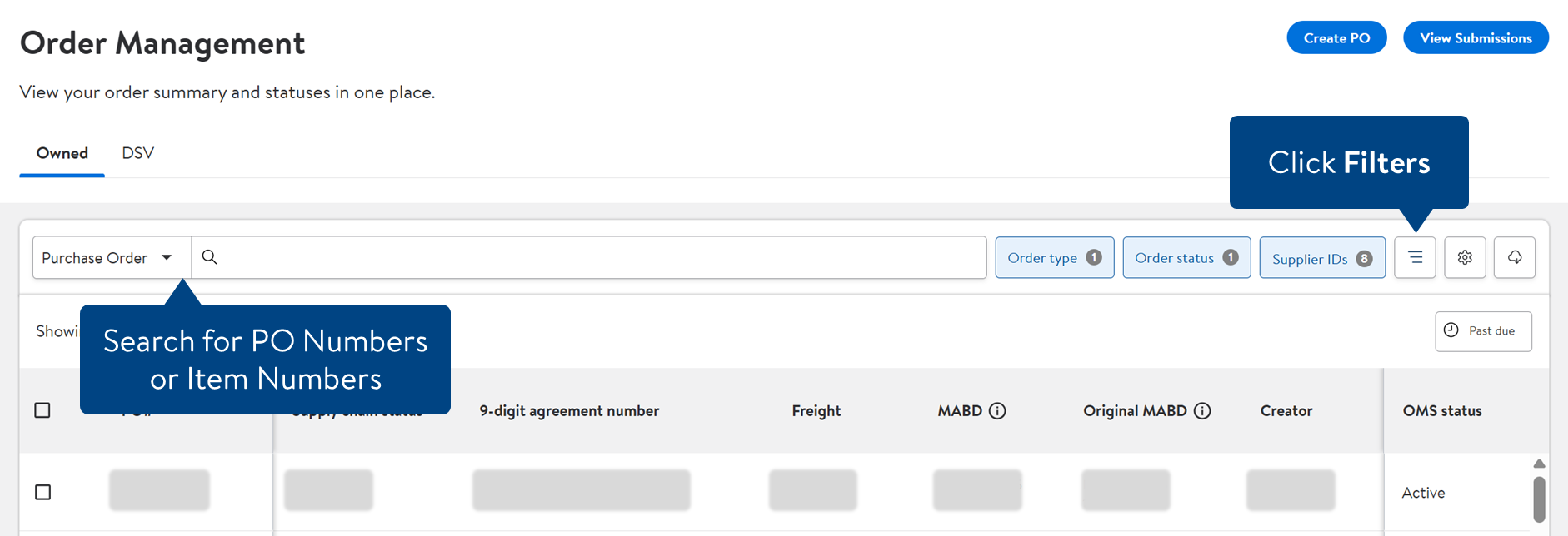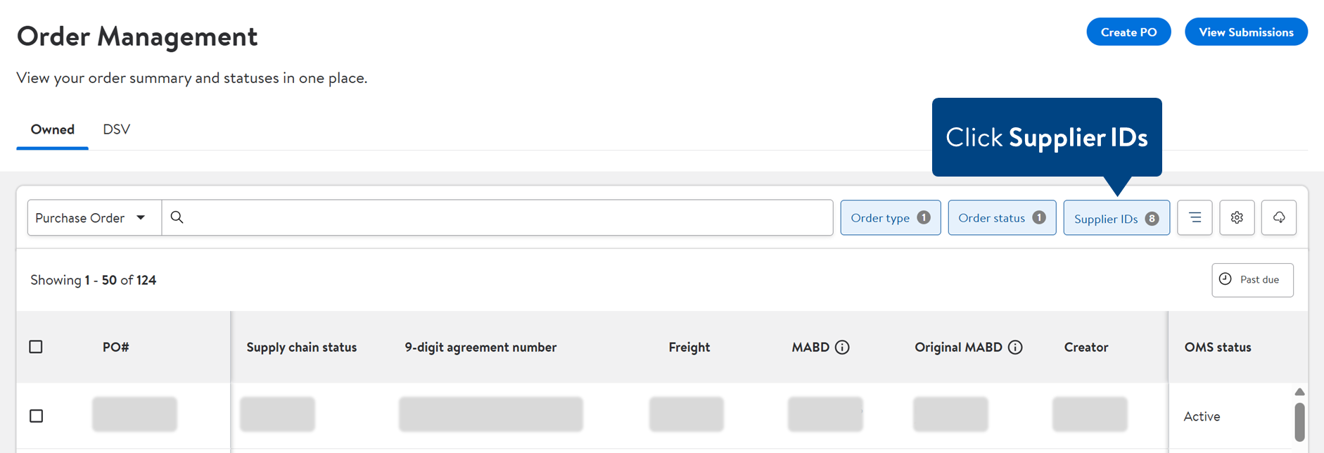 You can view Owned orders for all 6-digit and 9-digit agreement numbers or select specific numbers from the Supplier IDs filter.