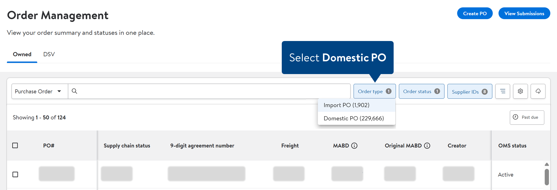 For domestic suppliers, select Domestic PO from the Order type filter.