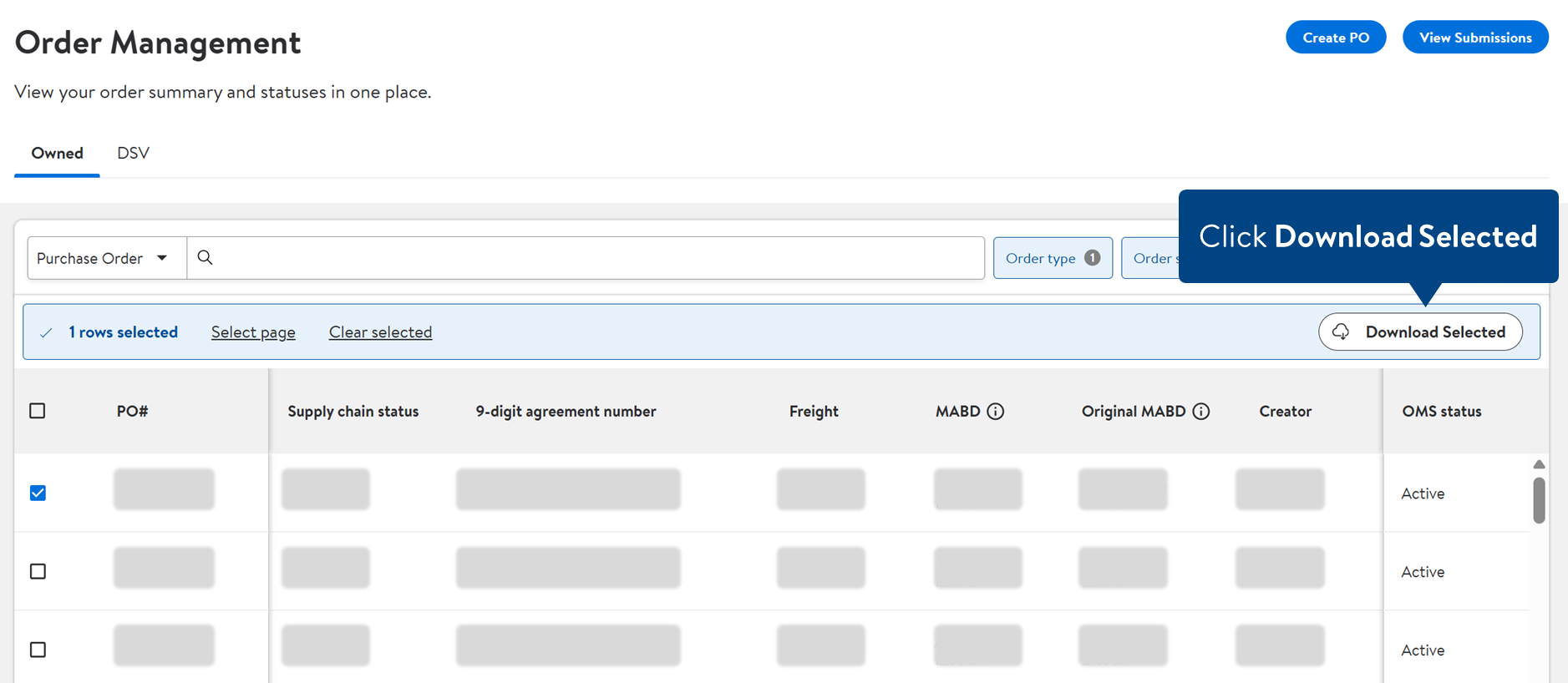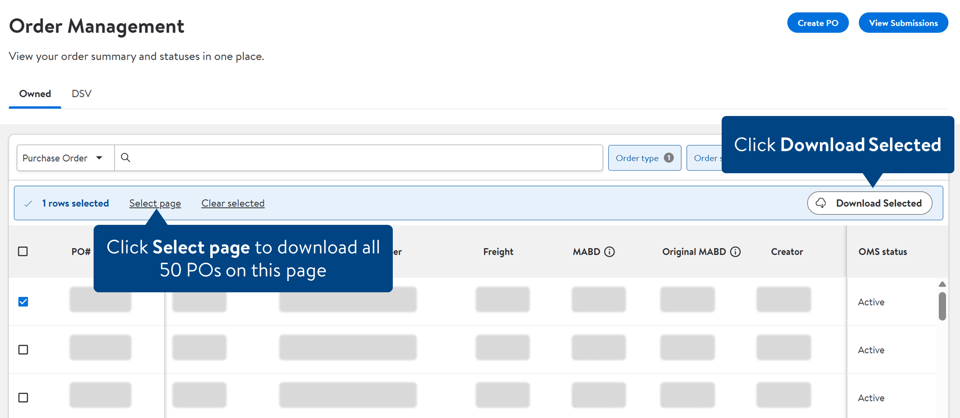 To download selected PO data, click the check boxes to select individual POs (up to 25). Then, click Download Selected.Or, click Select page to select all POs on the page. Then, click Download Selected.