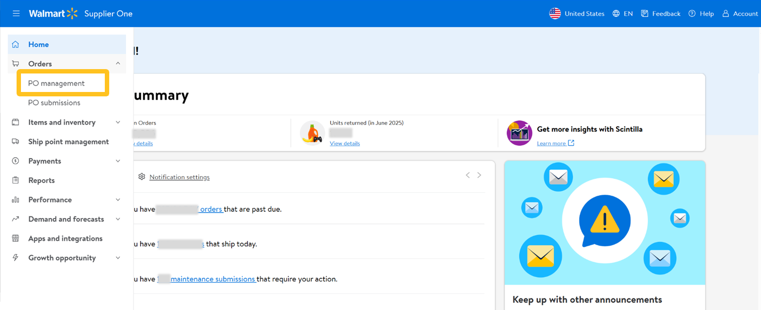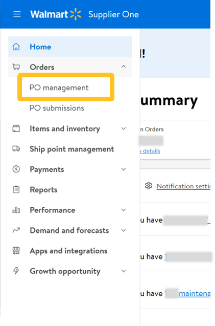 Click Orders > PO management in the left navigation menu to view all of your orders.