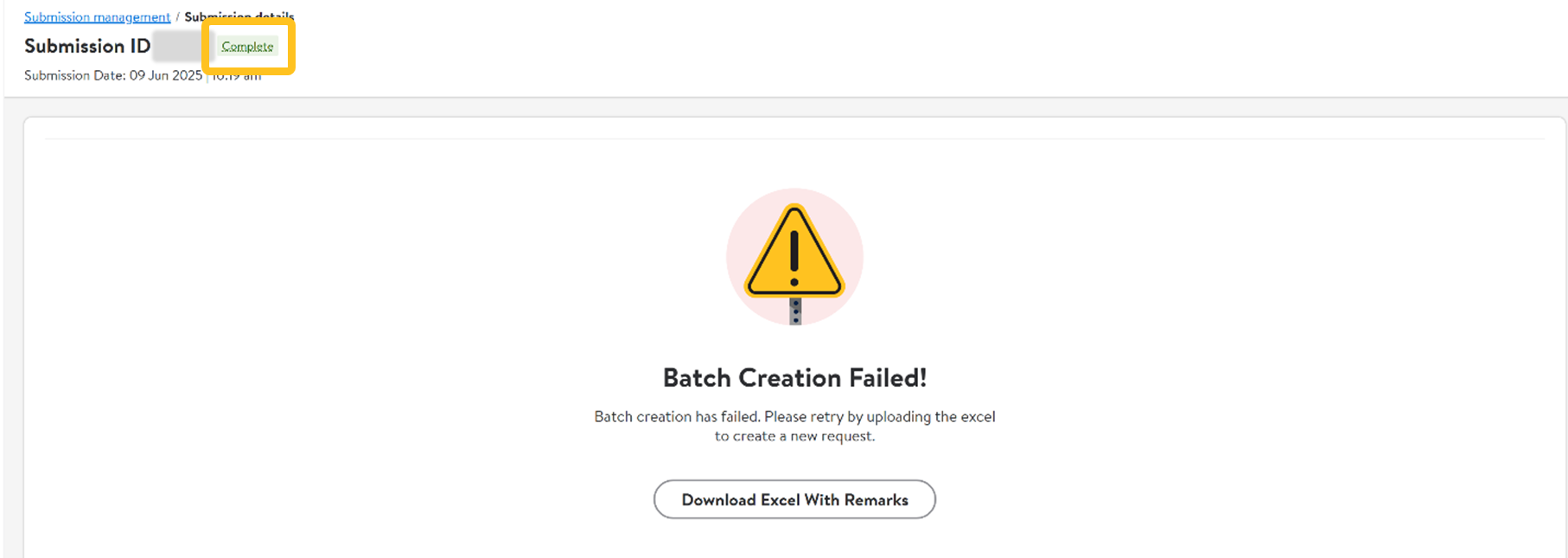 The submission status will change to Complete to reflect in the system that an action has been taken to resolved the failed status.