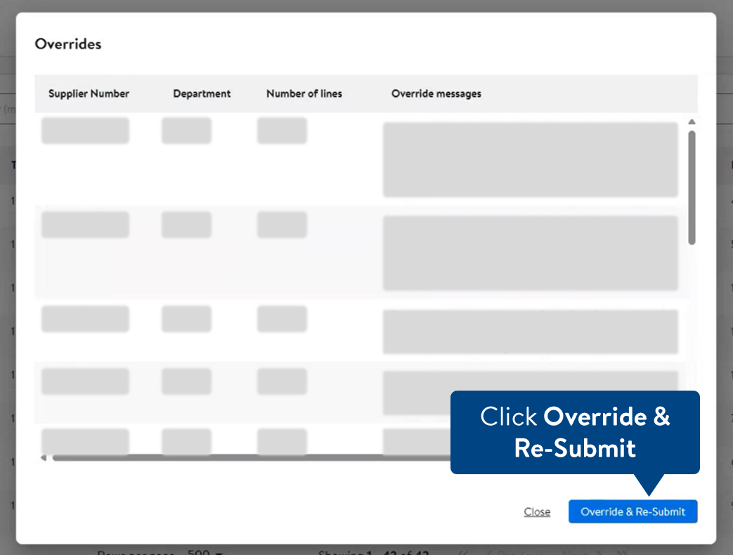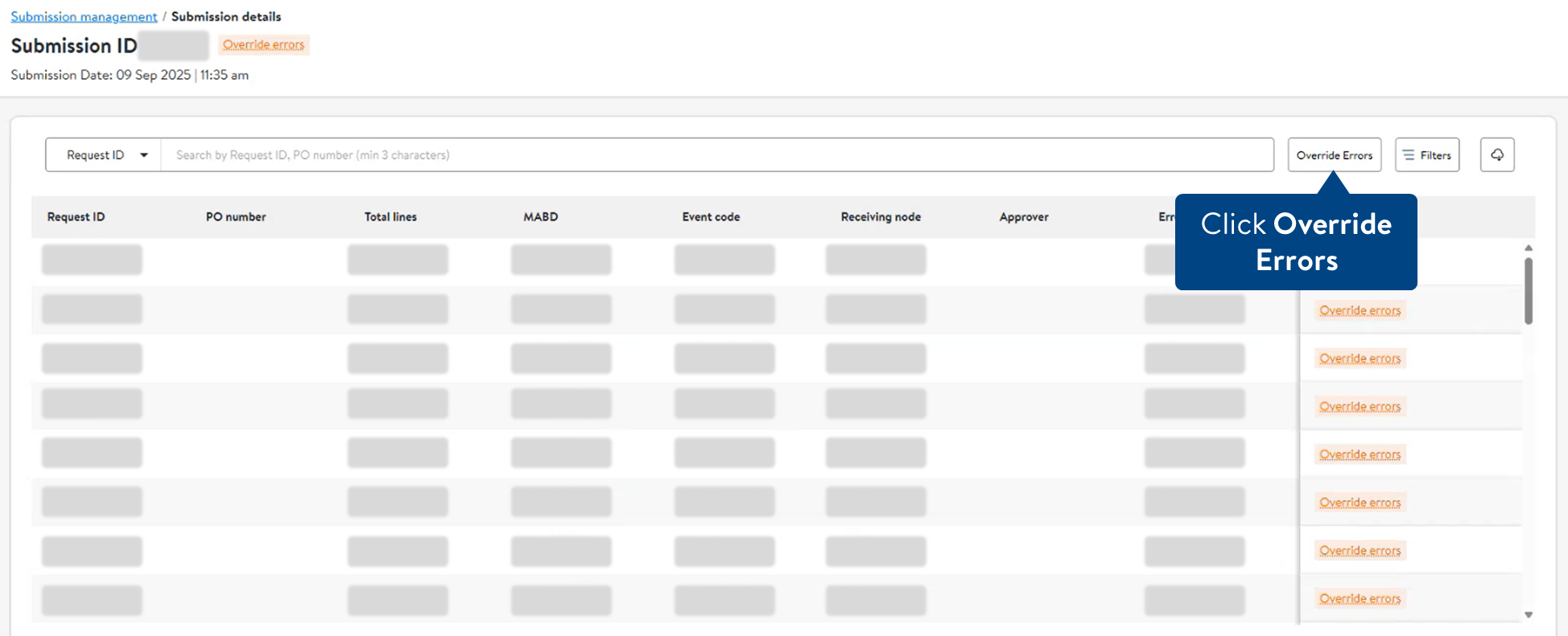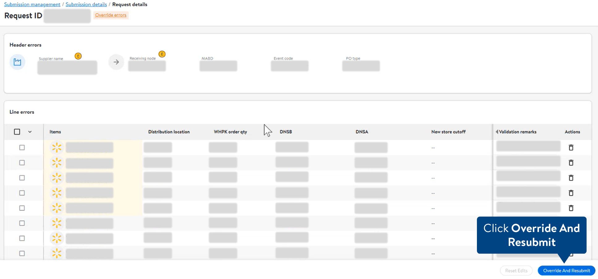 Review the override messages for all request IDs, then select Override & Re-submit.