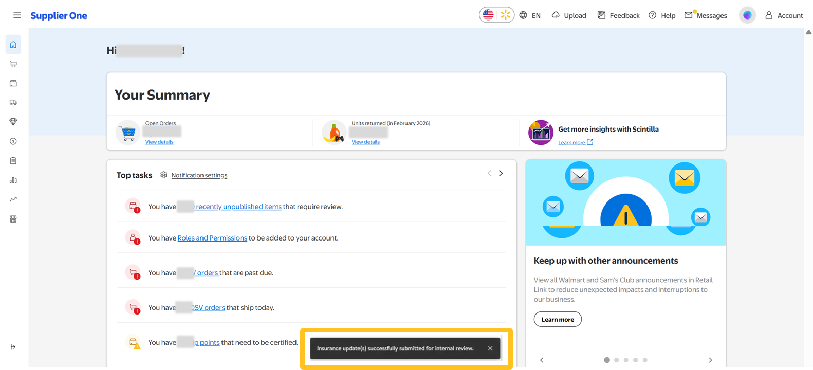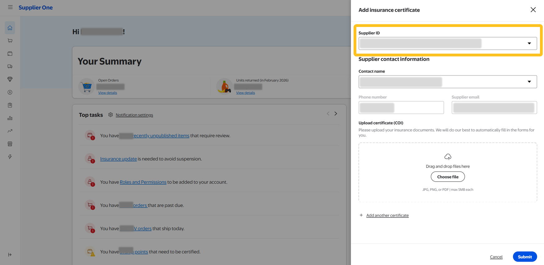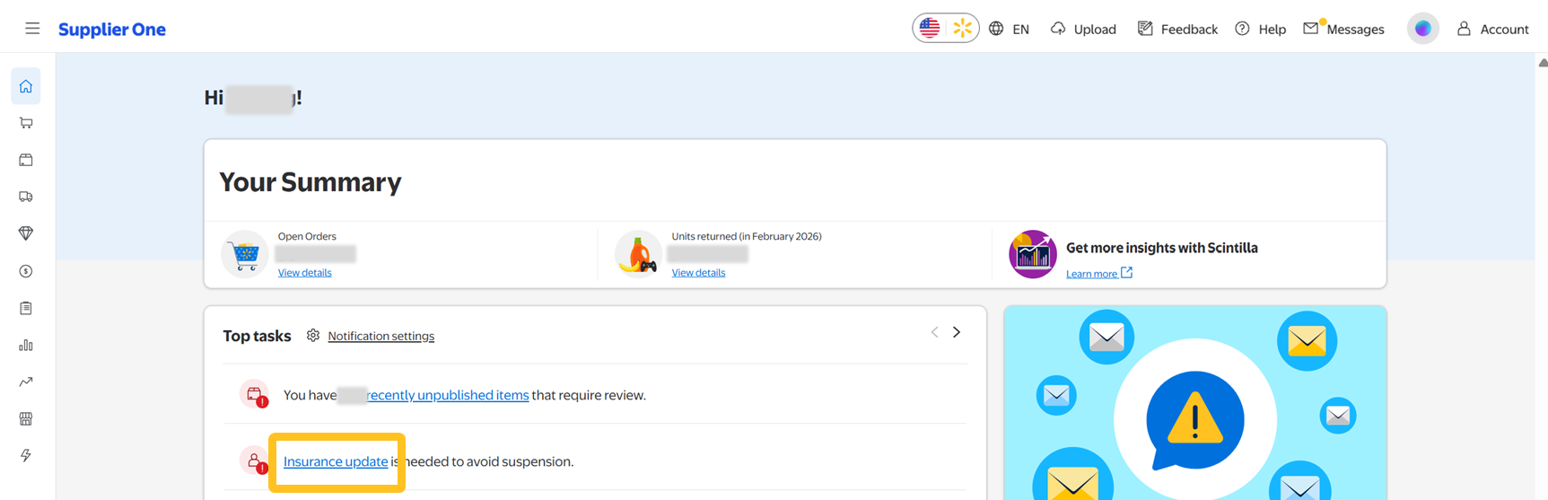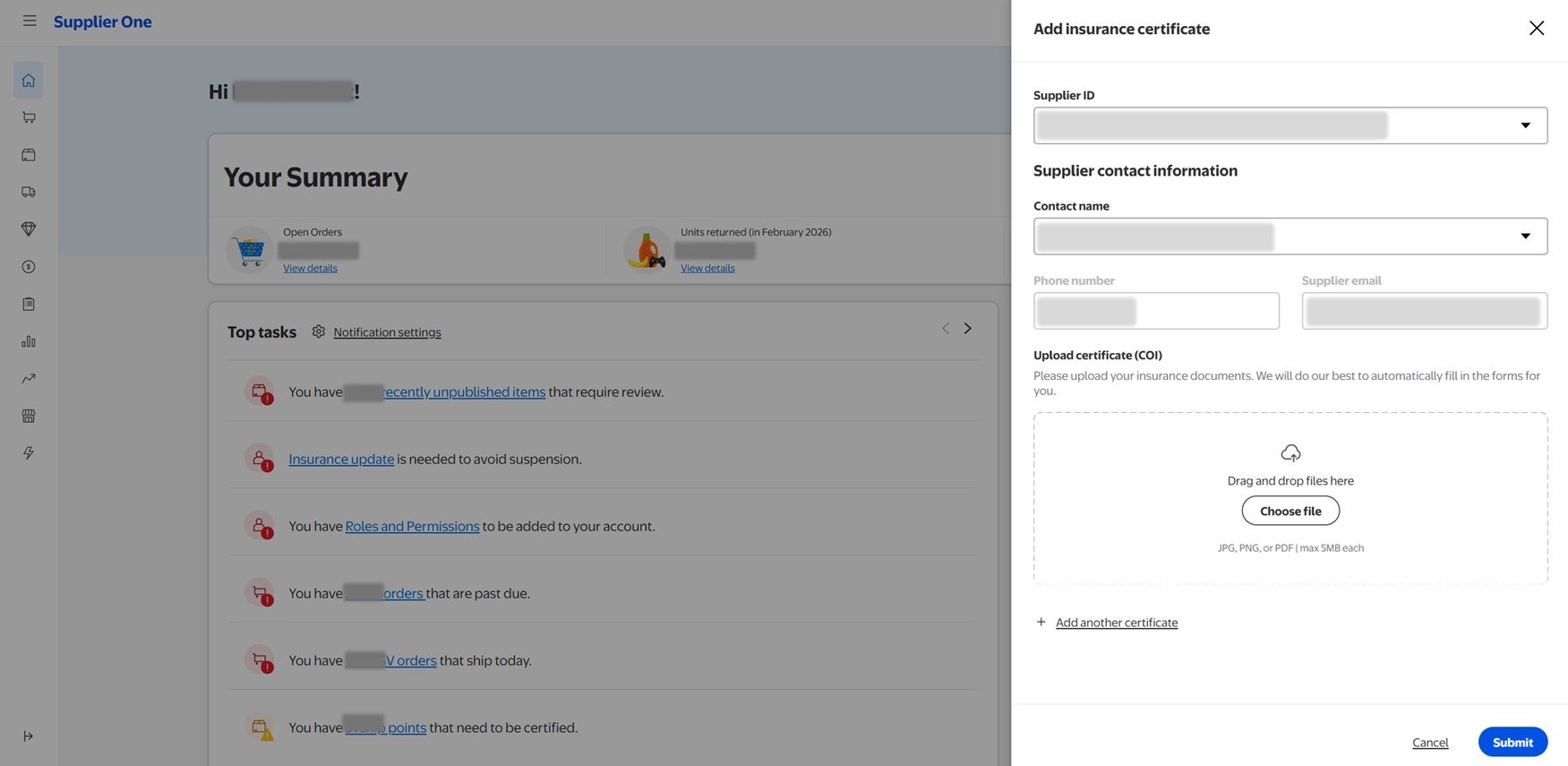 A task notification will appear in the Supplier One top tasks 30 days before your insurance expires. To renew your insurance, follow these steps. You can update insurance using one of two methods.