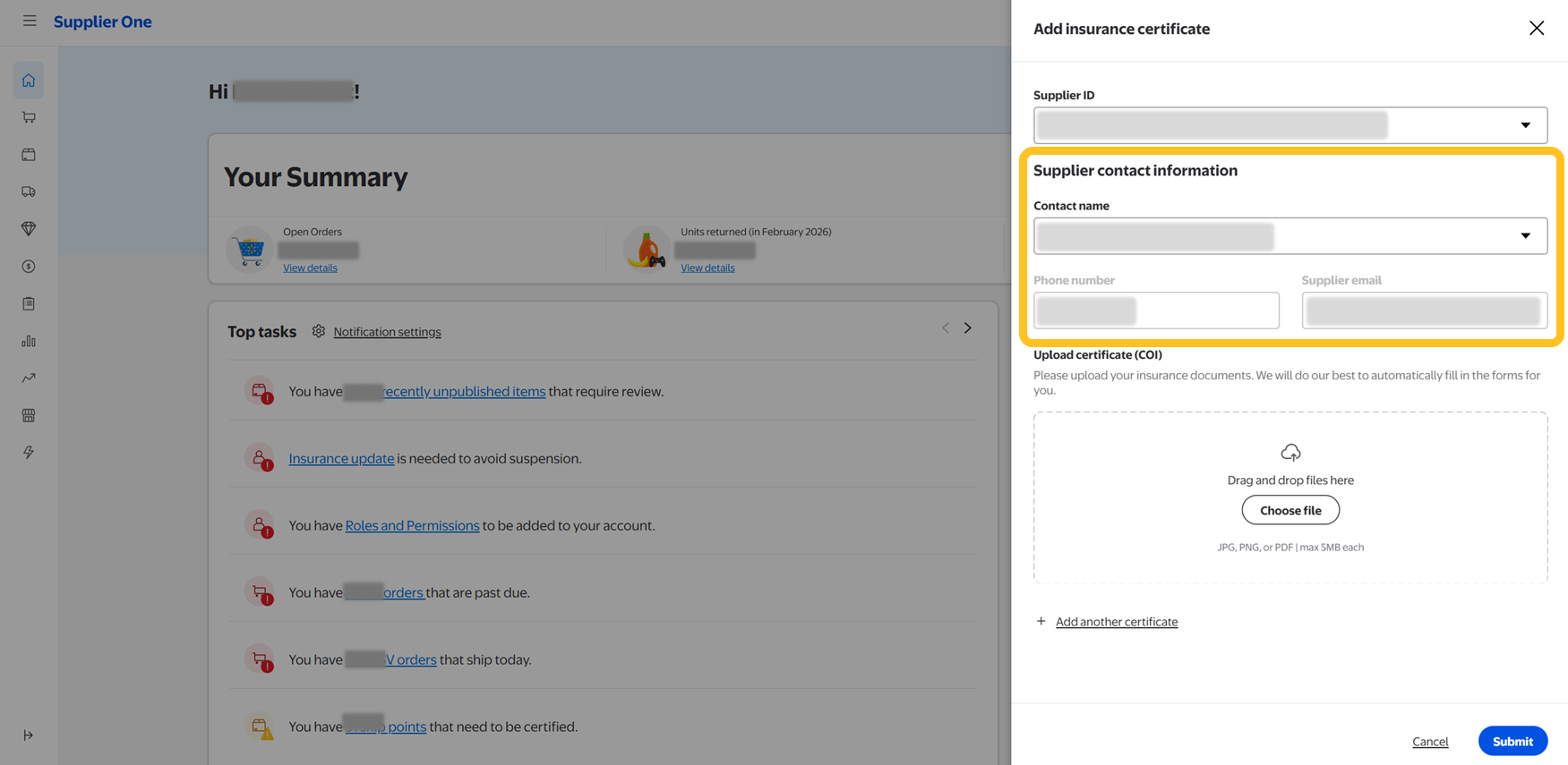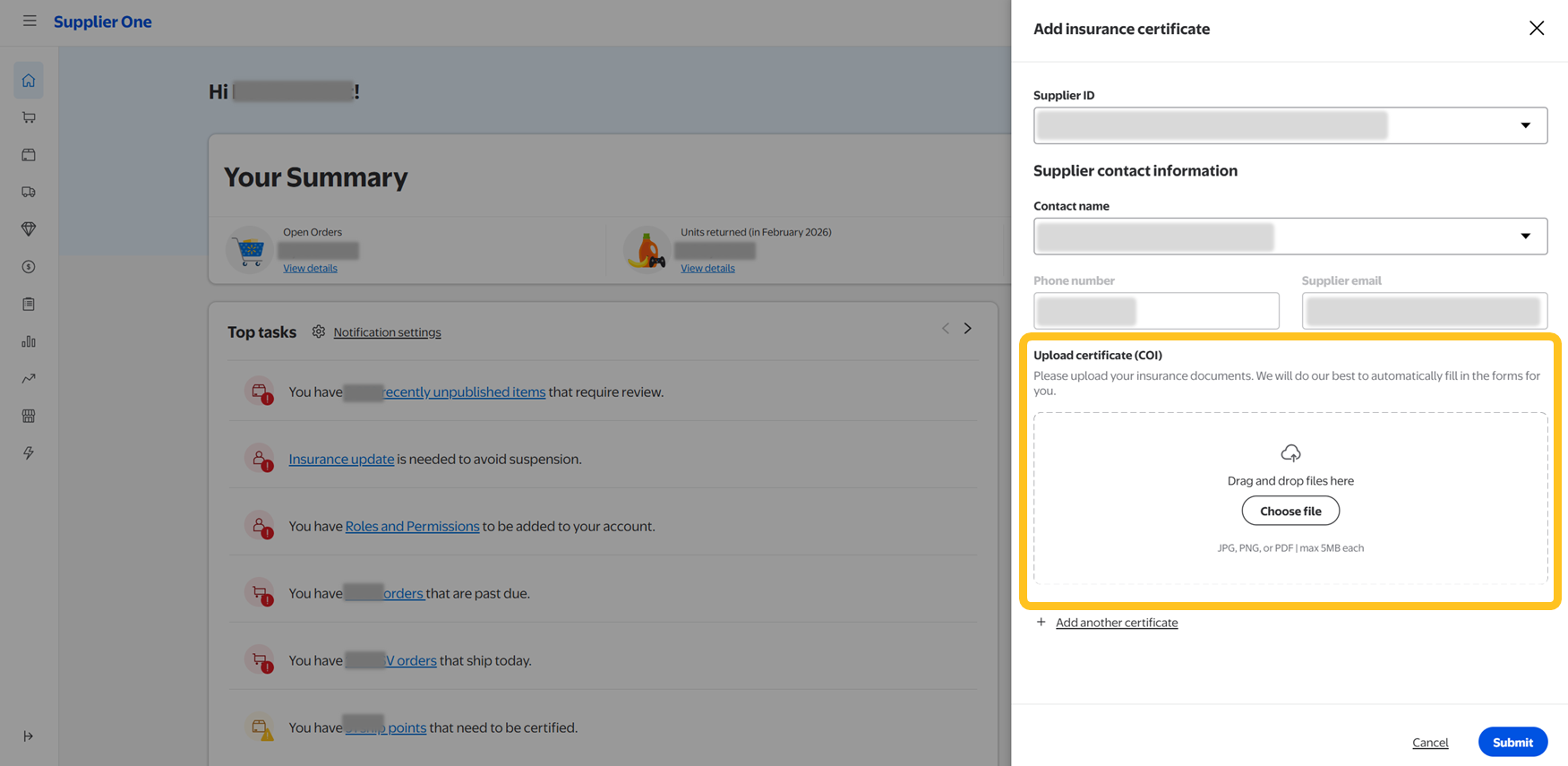 - Upload your Certificate of Insurance (COI) by dragging and dropping the file in the designated area or by clicking Choose file to open a file from your computer.