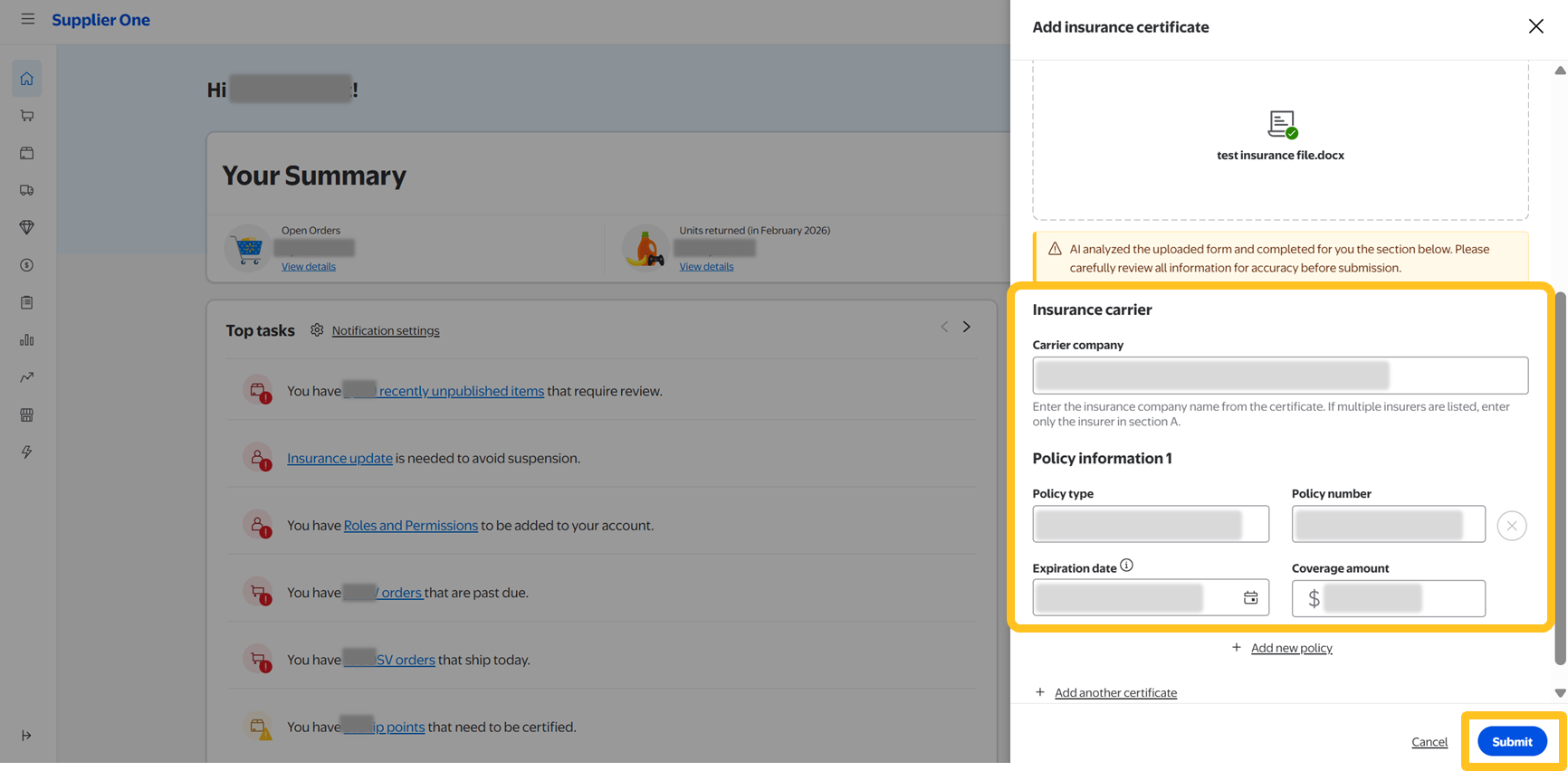 - The Carrier company, Policy Type, Policy Number, Effective date, Expiration Date, and Coverage amount will auto populate from the uploaded form. Then, click Submit.Carefully review all auto-populated information for accuracy before submitting.