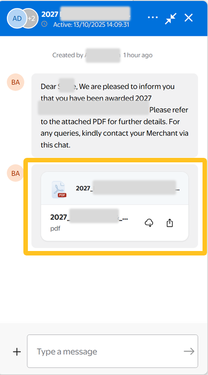 - You'll see the awarded business document in the chat. Select the cloud icon to download the PDF to your computer.