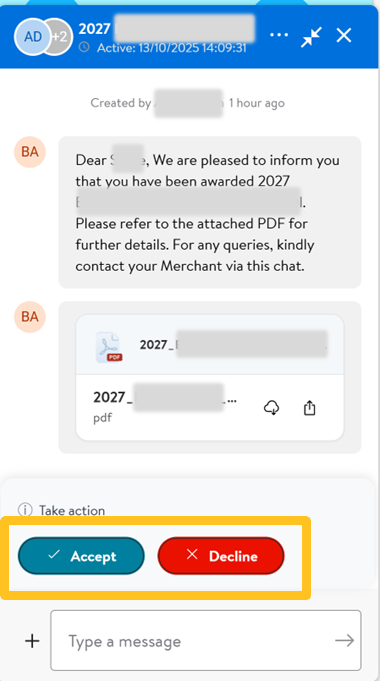 - Directly in the chat, select Accept or Decline the awarded business details.